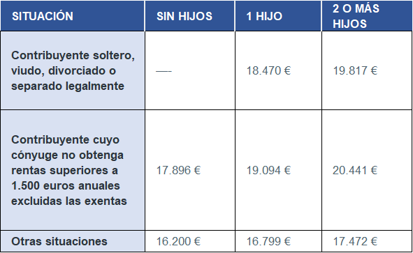- Primer caso: Si el importe total a percibir resulta inferior a los que figuran en la tabla siguiente, teniendo en cuenta que los hijos y descendientes a los que se refiere son aquellos que dan derecho a deducción en la declaración de la renta: