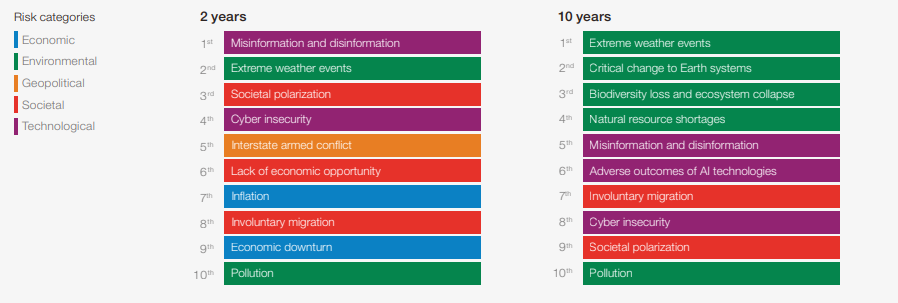 Entre los principales riesgos, a corto y largo plazo, destacan los medioambientales, los económicos, la polarización social, la desinformación o información falsa, los conflictos estatales armados, el malo uso de la inteligencia artificial y de otras tecnologías, así como la divisiones ideológicas y geopolíticas.