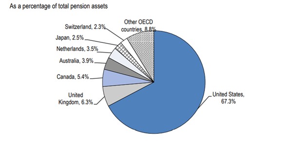 1. Estados Unidos tiene el mayor mercado de pensiones dentro de la OCDE (y del mundo), con activos por valor de 40 billones de dólares, que representan el 67,3% del área de la OCDE.