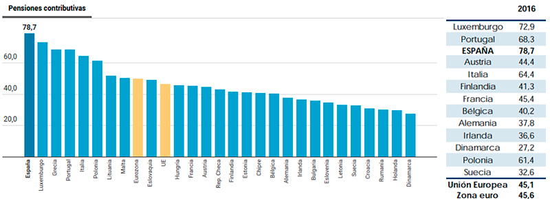 Si bien es cierto que la norma en los paises de nuestro entorno es que la revalorización de las pensiones públicas se haga de acuerdo al incremento de los precios, también lo es que ,salvo en los paises del sur de Europa que tienen pensiones con altas tasas de sustitución, en un número importante de países europeos las pensiones públicas son básicas , asistenciales, actuando en ocasiones como red de seguridad mínima, que se complementan con una parte de pensión privada del sistema de empleo ( obligatoria o semi-obligatoria) que representa una parte significativa de la pensión total. Revalorizar pensiones al IPC, sobre la base de pensiones sostenibles y de importe modesto ( o mejor dicho, de baja tasa de sustitución), es un objetivo mucho más realista, menos costoso y menos desestabilizador que revalorizar pensiones públicas muy generosas que, en el caso de España, suponen de media casi un 80% del salario medio.Comparativas tasas de sustitución pensiones públicas UE: